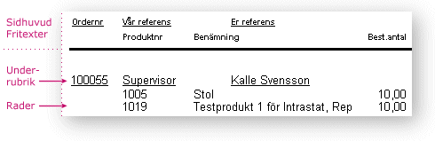 Underrubriker på samlingsfaktura Eftersom en faktura av typen samlingsfaktura kan innehålla flera ingående order, kan varje order innehålla unika uppgifter såsom t.ex. Vår referens eller Er referens. Detta innebär att dessa fält även kan väljas in på radnivå som underrubriker i blankettens design. Fälten från själva ordern på samlingsfakturan heter då t.ex. Er referens Rubrik och utgör en rubrik innan raderna i respektive order på fakturan enligt figuren nedan: |
