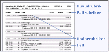 Varje fält som väljs in vid design motsvarar en kolumn vid utskriften. Raderna i kolumnerna kan sedan vara avdelande underrubriker och summeringar beroende på typ av rapport. |