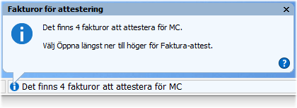 Det finns också möjlighet att direkt öppna funktionen Faktura-attest i samband med att meddelandet visas. |