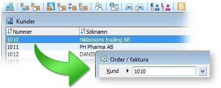 Figuren: Söklistan är aktiverad från Kunder och Sida vid sida är valt. En av kunderna dras in till en ny order i Order / faktura.