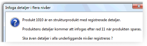 En annan skillnad blir även att vid Infoga detaljer, betraktas strukturen som infogas som tillhörande den produkt som har valts vid registrering, alltså får detaljerna den relativa undernivån i förhållande till huvudprodukten.