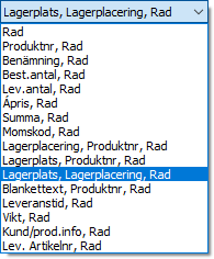 Exempelvis kanske en viss typ av faktura ska vara sorterad på radens Benämning medan en plocksedel sorteras på produktens Lagerplacering. Plocksedeln kommer i detta fall att sorteras enligt Lagerplacering, Produktnr och Rad. Om lagerplatser används kan raderna också sorteras på lagerplats och lagerplacering när flera olika lager ingår i en och samma kundorder. Sorteringen kan alltså sättas individuellt på varje typ av blankett, även med avseende på ordertyp och språkkod. |