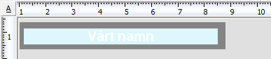 I exemplet har Vårt namn använts, d.v.s. företagsnamnet angivet i Inställningar allmänt i det aktuella företaget. Efter att man har högerklickat på arbetsytan i sektionen sidhuvud har en ny rektangel valts in. Som exemplet visar har inte rektangeln någon kantlinje, men däremot en fyllning som har angivits till mörkgrå. Vidare har färgen på själva texten satts till vit mot den grå bakgrunden. Texten kommer då att lysa igenom pappret och konturerna utgörs istället av bakgrundsfärgen.