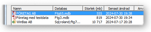 När en dialog med företag visas, t.ex. vid Ändra företag, är listan sorterad på företagets namn. Vidare innehåller listan själva databasens namn, det filnamn som databasen har på disken.