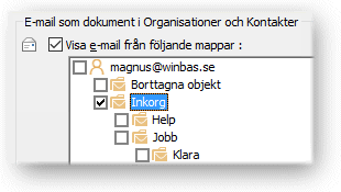 Visa e-mail från följande mappar bestämmer vilka av mapparna för e-mail som ska visas, välj t.ex. innehållet i standardmapparna Skickade brev och Inkorgen. Brev med kontaktens namn eller e-mailadress i Outlooks Standardmappar visas bakom dokumentfliken under respektive Organisation / Kontakt.