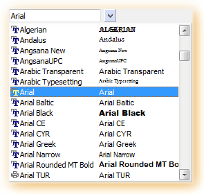 Listan över teckensnitt visar den grafiska presentationen av teckensnittet i den högra kolumnen och namnet till vänster i klartext, beroende på att teckensnitt kan bestå av t.ex. symboler som då är svåra att tyda.