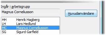 Administratören registrerar arbetsgruppen och väljer in alla användare med knappen Alla. Administratören väljer sedan sig själv som huvudanvändare för arbetsgruppen. |