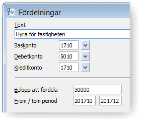 Fördelningar används för att fördela ett belopp över ett antal perioder. När en fördelning har bearbetats via Fördelningar utföres kommer den del av beloppet som avser perioden att räknas av och visas som fördelat belopp.