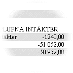 Då balansräkningen skrivs ut kommer periodiserade transaktioner som hänförs fram i tiden, d.v.s. efter balansrapportens slutperiod, att samlas upp på Konto för förutbetalda kostnader och upplupna intäkter angivet i inställningar för bokföring. Periodbeloppet och det ackumulerade beloppet i balansrapporten innehåller då summan av konteringarna framåt med vänt tecken, d.v.s. att kontering registrerad i kredit påverkar periodbeloppet positivt. Liksom övriga belopp i balansrapporten, bygger periodiserade transaktioner framåt på uppdaterade verifikationer. |