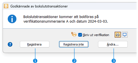 Registrera inte betyder att ingen verifikation kommer att registreras. Godkännande kommer inte att utföras och bokslutstransaktionerna ligger kvar för godkännande vid ett senare tillfälle.