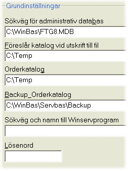 Sökväg för administrativ databas Programmet läser ut Artiklar, Kunder, Leverantörer och Lagerplatser från Winbas databas. Dessutom sker inläsning av ordrar till angiven databas. Sökvägen till Databasen ställs in under: Sökväg för administrativ databas. OBS! Fälten Utdelningsadress och Postadress från kunder/leverantörer i Winbas läses endast första raden över till WinServ. |