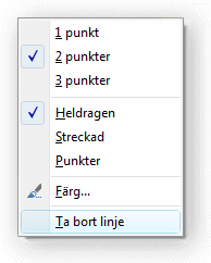 Genom att klicka och dra, kan linjen flyttas i höjdled. Vid högerklick på linjen kan tjocklek väljas. Tjockleken kan t.ex. sättas till samma som för de linjer som väljs i blankettens disposition, Linje mellan huvud - rader (3 punkter) eller Linje mellan varje rad som normalt är 1 punkt beroende på inställningar. Normalt är stilen på linjen en heldragen linje, den kan också skrivas ut som streckad linje eller linje med punkter. |