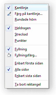 För att använda eller ta bort t.ex. kantlinje och fyllning, högerklicka på själva rektangeln för att få tillgång till menyalternativen. I menyn kan även färg på kantlinjen och fyllningsfärg ställas in. Alternativet Rundade hörn innebär att rektangelns hörn rundas av, istället för att utgöra räta vinklar. Normalt är stilen på kantlinjen en heldragen linje, den kan också skrivas ut som streckad linje eller linje med punkter. Alternativet Enbart sista sidan kommer enbart att skriva rektangel på sista sidan när blanketten består av flera sidor, t.ex. när en rektangel används för att rama in slutsummorna i sidfoten som också bara kommer på sista sidan. |
