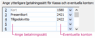 Ytterligare betalningssätt för Kassa och eventuella konton visar utöver kontant som alltid används, de övriga betalningssätt som kan användas vid betalning i Kassa. Om man avser att dela upp betalningssätten på olika konton anges dessa konton här. Om inga konton är angivna kommer alltid kontot kopplat till betalningsvillkor kontant att användas.