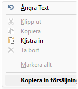I de fall man främst avser att använda t.ex. försäljningstexten till andra ändamål, och därmed reservera orderkommentaren för annan typ av information kan man koppla bort dessa förslag. Om man väljer att generellt koppla bort förslaget av produktens t.ex. försäljningstext, kan man fortfarande i det enskilda fallet använda alternativet Kopiera in försäljningstext från produkt genom att högerklicka på kommentaren i exempelvis Order / faktura. Alternativet visas när det finns en försäljningstext och ingen kommentar tidigare är angiven. |