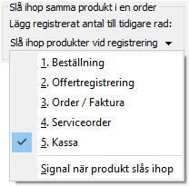 Vid registrering med läspenna eller pekskärm i kassa, kan inställningen Slå ihop produkter vid registrering bestämma i vilka funktioner registrerat antal på den nya raden ackumuleras till en tidigare befintlig rad med samma produkt.
