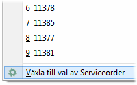 När man har klickat på rubriken visas senaste använda order i listan och längst ner återfinns alternativet för att Växla till val av serviceorder. Välj detta alternativ för att växla söklistans läge till Serviceorder, eller för att efteråt växla tillbaka till vanliga kundorder i Order / faktura. |