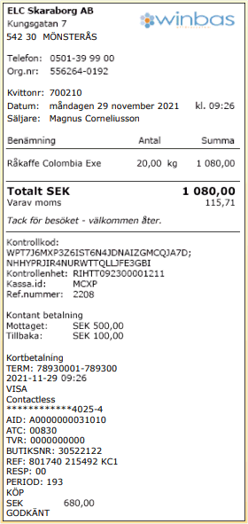 När köpet är genomfört skrivs kvittot ut med uppgifter enligt den ordinarie designen. Därefter följer information om betalningen och uppgifter som har returnerats av kortterminalen.