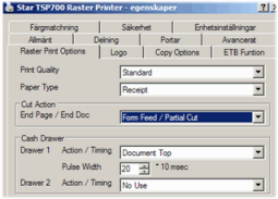 Kvittoskrivaren är kopplad mot datorns parallellport och kassalådan är i sin tur kopplad mot skrivaren. Genom drivrutinen i windows kan man ställa in diverse funktioner såsom när kassalådan skall öppnas och hur kvittot skall klippas m.m. Cut Action och Cash Drawer styr klippning och kassalåda. |