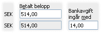 Fakturasumman och betalt belopp innehåller bankavgiften. Ange beloppet som avgiften ingår med i det betalda beloppet som Bankavgift ingår med. Avgiften ligger i beloppsraden för SEK och anges alltid i SEK. |