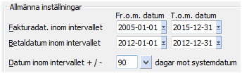 Vid registrering av kundfaktura eller inbetalning ska fakturadatum respektive betaldatum anges. Genom att sätta ett intervall för respektive datum i Inställningar för kunder kan felaktiga registreringar begränsas.