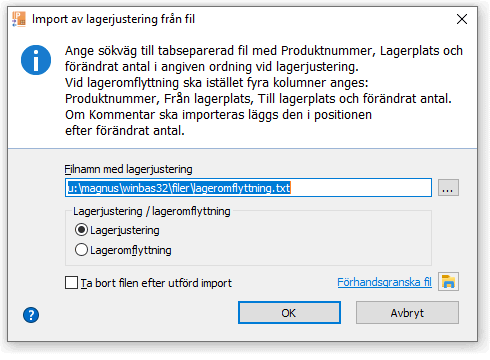 Inläsning av data från fil skapad i t.ex. Excel med transaktioner som utgör underlag för lagerjustering eller lageromflyttning mellan lagerplatser.