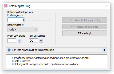 Om knapparna <Skapa betalningsförslag> och <Manuell registrering> är inaktiva finns det en förklarande text som lyder: Föregående betalningsförslag är godkänt men alla utbetalningslistor är ej utskrivna, och en hänvisning till vilket betalningssätt som innehåller ej utskrivna utbetalningar. I detta läge måste betalningar skrivas ut på de betalningssätt som inte är utskrivna för att ett nytt betalningsförslag ska kunna skapas.