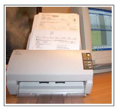 Bunten med fakturor och bilagor läggs i scannern och visas sedan i datorn.