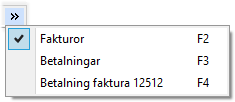 Det är också möjligt att se utbetalningar gjorda till leverantören. Funktionen kan t.ex. användas för att se avbetalningar från kreditnotor eller detaljgranska när olika eventuella delbetalningar har gjorts på en och samma leverantörsfaktura. Längst ner till höger i fönstrets statusrad visas en knapp med alternativ, eller flikar beroende på fönstrets storlek.
