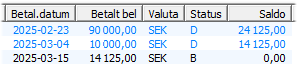 Kolumnerna Status och Saldo återspeglar betalningen vid betalningstillfället när flera delbetalningar förekommer. Om fakturan har delbetalats kommer status för betalningen att vara D - Delbetald. När fakturan har betalats fullt ut visar den sista betalningen Status B - Betald. Saldo visar det resterande beloppet efter varje betalning, och kommer då att vara noll när fakturan är fullt betald.