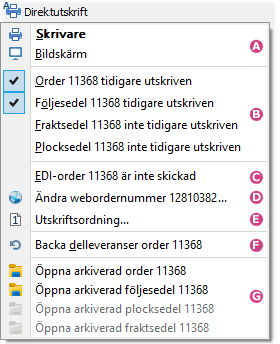 Genom att klicka på symbolen för direktutskrift är det möjligt att ta fram en tidigare utskriven blankett från Blankettarkivet. De blanketter som finns lagrade kommer också att vara aktiverade och möjliga att välja i menyn. Använd funktionen för att titta på eller skriva ut en tidigare utskrift av t.ex. orderblanketten eller en tidigare version av följesedeln. Se följande avsnitt för ytterligare information:
