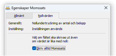 Istället för att koppla bort den generella inställningen för att hantera nollvärden i antal och belopp som påverkar alla blanketter, kan inställningen för att skriva ut nollvärden nu göras för det enskilda fältet.