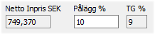 Om istället täckningsgraden används för nettoprissättning, kan fältet TG öppnas för inmatning. Inmatning föreslår då istället pålägget baserat på angiven täckningsgrad. |