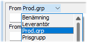 Genom att ange ett eget urval på valfritt begrepp i produktregistret, istället för standardalternativet produktgrupp, kan utskrift göras på det valda begreppet. Detta innebär lagervärderingen även kan väljas baserat på t.ex. prisgrupp eller inom ett intervall av leverantörer registrerade som produktens huvudleverantör. |