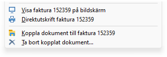 Genom att högerklicka på fakturan i listan visas menyalternativ för visa fakturan och registrerade bilagor, samt att hantera bilagor till fakturan.