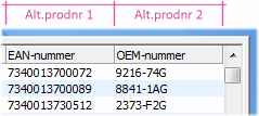 Detta ger även möjlighet att sortera listan på begreppen genom att klicka på kolumnernas rubriker, göra snabbsökning i listan genom att skriva in nummer, och även skriva ut sortimentet med alternativa nummer och varianter till t.ex. bildskärm eller Excel med valda kolumner. Detta med exempelvis ean-nummer, modellnummer och liknande begrepp som har definierats som alternativa produktnummer i inställningar för produkter. |