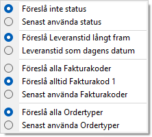 Normalt föreslås fakturakod 1 och order av alla ordertyper i dialogen Fakturering. Genom att ställa in senast valda intervall för fakturakoder kommer den att föreslås automatiskt nästa gång funktionen används. Detsamma gäller ordertyper som också kan ställas in att t.ex. alltid bara föreslå en viss ordertyp. |