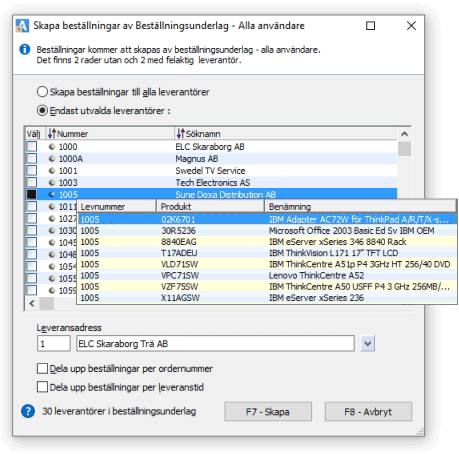 När ett beställningsunderlag är färdigbearbetat, välj F6 - Skapa beställningar för att skapa beställningar av registrerade underlag. Raderna kommer då att delas upp på respektive leverantör.