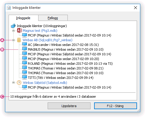 Figuren ovan visar t.ex. att datorn MCXP är inloggad i två administrativa företag via Winbas Säljstöd, samt att MCXP även är inloggad i Winbas.