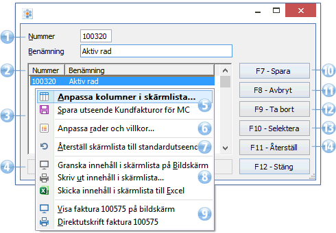 Alternativet Anpassa kolumner i skärmlista medger val av vilka fält, då i huvudsak från själva grundregistret men även beräknade fält såsom summor som ska visas på skärmbilden.