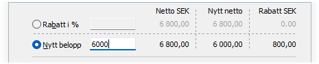 Skärmen visar orderns aktuella nettobelopp och rabatten efter angivelse av det nya beloppet. Justering motsvarande den totala rabatten kommer då att utföras antingen som en rabatt eller som en sänkning av priset på ingående rader i ordern.