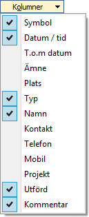 Kolumner. Det är också möjligt att välja in kolumner, eller välja bort fördefinierade kolumner ur listan. Bland kolumner som kan väljas in märks bl.a. Ämne och Plats, samt kontaktens telefonuppgifter. Kolumnen Symbol visar färg och eventuell symbol för kalendertypen i början av varje rad.