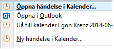 Man kan direkt från fliken också öppna den i Outlook, eller skapa en ny händelse i kalendern med den berörda kontakten automatiskt föreslagen genom att högerklicka på skärmlistan.
