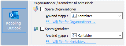 Utöver de som uppdateras som standard finns det möjlighet att välja vilka fält som ska uppdateras när en organisation eller kontakt sparas i Outlook.