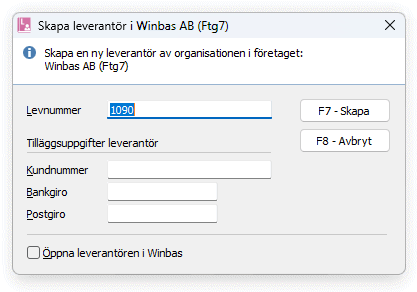 Nästa nummer. Dialogen föreslår nästa leverantörnummer angivet i Inställningar leverantör för det aktuella företaget. Om det istället är en ny kund som ska skapas, föreslås motsvarande från Inställningar kund i Winbas inställningar för administration. Det går även bra att registrera ett annat nummer om så önskas.