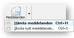 Funktionerna (Hämta) Meddelanden och Skicka meddelande är belägna under knappraden och arkivmenyn. Själva knappen används för att hämta meddelanden och i meny (Pil-Ner) finns Skicka meddelande. Dessa funktioner nås alltid genom Ctrl+H och Ctrl+S. |