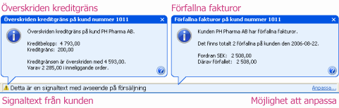 Alla som dialogrutor I följande exempel är alla varningar och signaler istället inställda som dialogruta och varje varning bekräftas med knappen OK eller tangenten Enter: Blandade varningar Flera varningar och signaler kan även visas som dels som dialogruta och dels som meddelande. T.ex. kanske varningen Förfallna fakturor visas i dialogruta och varningen Överskriden kreditgräns som meddelande i statusraden. |
