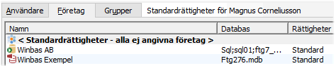 Bakom skärmlistan för användare finns företagen. Genom att ange ett företag visas rättigheterna för detta företag. Har företaget inte har egna rättigheter visas standardrättigheterna, detta indikeras med Standard i kolumnen till höger. Om företaget har egna rättigheter visas Egen.