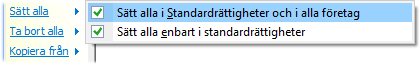 När specifika rättigheter används för enskilda företag, finns ytterligare verktyg för att underlätta underhållet av rättigheter för administratören. Genom att först välja en användare och ett företag i fliken Företag visas följande funktioner när alternativet Företag väljs, eller när man högerklickar på företaget i listan: