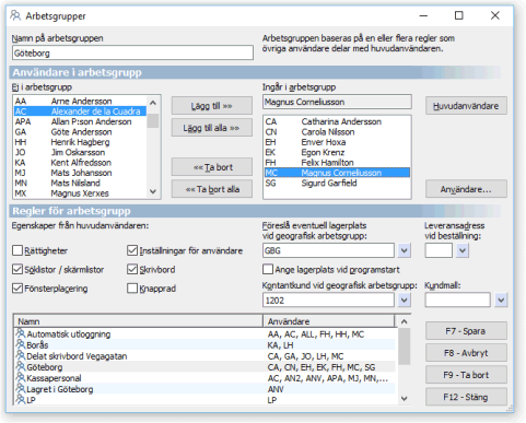 Om huvudanvändaren har ställt in senast använda position och storlek och justerat ett antal fönster och inmatningsformulär, kommer dessa inställningar att gälla för alla i gruppen. Notera här att användare i en grupp med gemensam fönsterplacering då också bör ha likartade storlekar på bildskärm.
